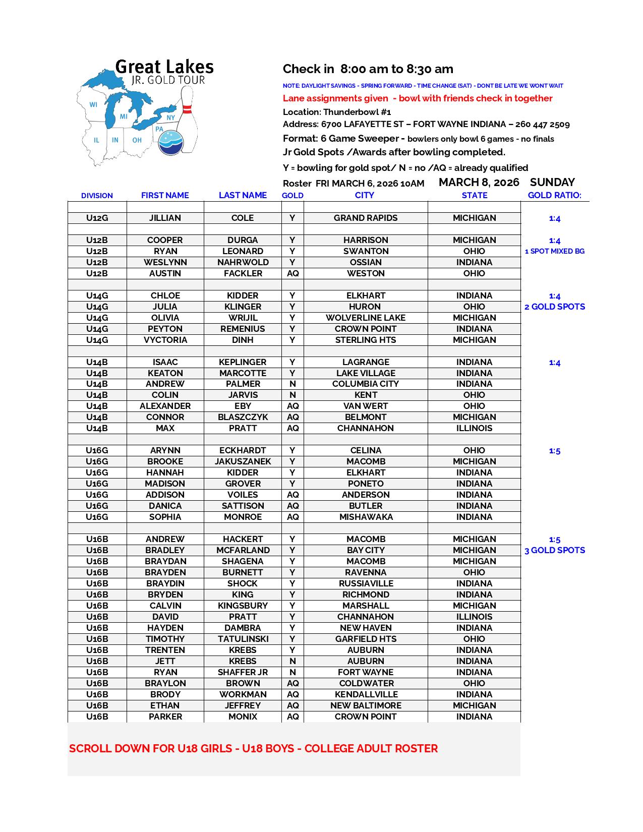 CURRENT EVENT ROSTER – MARCH 8, 2026 (Sunday) posted the week before the tournament (TUES 2PM-THURS 2PM- SAT 1AM) SCROLL DOWN AND ENLARGE YOUR SCREEN TO VIEW